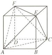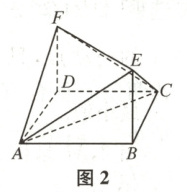 5. (2024江苏常州期中)一种糖果的包装纸由一个边长为$6$的正方形和$2$个等腰直角三角形组成(如图1),沿$AD,BC$将$2$个三角形折起到与平面$ABCD$垂直(如图2),连接$EF,AE,CF,AC$。若点$P$满足$\overrightarrow{DP}=x\overrightarrow{DA}+y\overrightarrow{DC}+z\overrightarrow{DF}$且$x + y + z = 1$,则$|\overrightarrow{EP}|$的最小值为