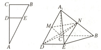 6. (2024四川绵阳期中)在$Rt\triangle ABC$中,$\angle C = 90^{\circ}$,$BC = 3$,$AC = 6$,$D,E$分别是$AC,AB$上的一点,满足$DE// BC$且$DE$经过$\triangle ABC$的重心。将$\triangle ADE$沿$DE$折起到$\triangle A_{1}DE$的位置,使$A_{1}C\perp CD$,$M$是$A_{1}D$的中点,如图所示。点$N$在线段$A_{1}B$上($N$不与端点$A_{1},B$重合),使平面$CMN$与平面$DEN$垂直,则$\dfrac{A_{1}N}{BN} = $