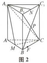 (2) 如图2,$M$是棱$AB$的中点,$N$是棱$B_{1}C_{1}$的中点,$P$是$BC_{1}$与$B_{1}C$的交点。线段$A_{1}N$上是否存在点$Q$,使得$PQ//$平面$A_{1}CM$?若存在,请确定点$Q$的位置;若不存在,请说明理由。