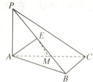 11. $-\frac{1}{8}$ 连接$EC$,如图。因为$PA \perp$平面$ABC$,$BC \subset$平面$ABC$,所以$PA \perp BC$。又$AB \perp BC$,$PA \cap AB = A$,$PA,AB \subset$平面$PAB$,所以$BC \perp$平面$PAB$。又$PB \subset$平面$PAB$,所以$BC \perp PB$。因为$M$是$AC$的中点,所以$\overrightarrow{EM} = \frac{1}{2}(\overrightarrow{EA} + \overrightarrow{EC}) = \frac{1}{2}\overrightarrow{EA} + \frac{1}{2}(\overrightarrow{EB} + \overrightarrow{BC})$。又$AE \perp PB$,$\overrightarrow{EP} · \overrightarrow{EM} = \overrightarrow{EP} · [\frac{1}{2}\overrightarrow{EA} + \frac{1}{2}(\overrightarrow{EB} + \overrightarrow{BC})] = \frac{1}{2}\overrightarrow{EP} · \overrightarrow{EA} + \frac{1}{2}\overrightarrow{EP} · \overrightarrow{EB} + \frac{1}{2}\overrightarrow{EP} · \overrightarrow{BC} = \frac{1}{2}\overrightarrow{EP} · \overrightarrow{EB} = -\frac{1}{2}|\overrightarrow{EP}||\overrightarrow{EB}| \geq -\frac{1}{2}(\frac{|\overrightarrow{EP}| + |\overrightarrow{EB}|}{2})^2 = -\frac{1}{8}$,当且仅当$|\overrightarrow{EP}| = |\overrightarrow{EB}| = \frac{1}{2}$时,等号成立,所以$\overrightarrow{EP} · \overrightarrow{EM}$的最小值为$-\frac{1}{8}$。