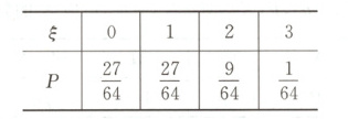$E(\xi)=0 × \frac{27}{64}+1 × \frac{27}{64}+2 × \frac{9}{64}+3 × \frac{1}{64}=\frac{3}{4}$.