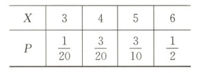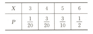 解法2 随机变量$X$的取值有3,4,5,6.$P(X=3)=\frac{1}{C_{6}^{3}}=\frac{1}{20}$,$P(X=4)=\frac{C_{3}^{2}}{C_{6}^{3}}=\frac{3}{20}$,$P(X=5)=\frac{C_{3}^{2}}{C_{6}^{3}}=\frac{3}{10}$,$P(X=6)=\frac{C_{3}^{3}}{C_{6}^{3}}=\frac{1}{2}$.