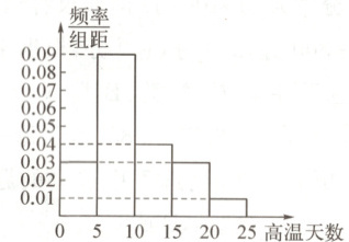 (1) 由题意知某年为高温年的概率为 $(0.03 + 0.01) × 5 = 0.2$,设今后 4 年中高温年出现 $X$ 年,则 $X \sim B(4,0.2)$,所以 $P(X \geqslant 3)=P(X = 3)+P(X = 4)=C_4^3 × 0.2^3 × 0.8^1 + C_4^4 × 0.2^4 = 0.0272$. 故今后 4 年中,甲地至少有 3 年为高温年的概率是 0.0272.