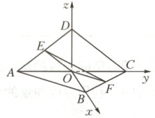 9. (多选题,2024福建泉州期中)在菱形纸片$ ABCD $中,$ E,F $分别为$ AD,BC $的中点,$ O $是菱形$ ABCD $的中心,$ AB = 2 $,$ \angle ABC=\dfrac{2\pi}{3} $,将菱形纸片$ ABCD $沿对角线$ AC $折成直二面角,以$ O $为原点,$ \{ \overrightarrow{OB},\overrightarrow{OC},\overrightarrow{OD} \} $为正交基底,建立如图所示的空间直角坐标系,则(