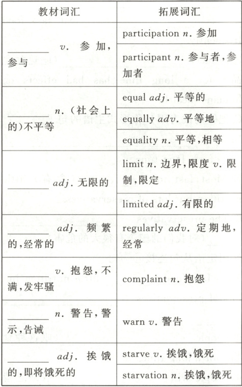 II. honour;decoration;freedom; participate; inequality; limitless; regular; complain; warning; starving