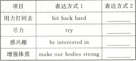 写作研习课【写词块,转换表达方式】hit back with great strength; try one’s best; show interest in; build up our bodies【补要点,写长、短佳句】①an art ②strength and skill③I think it is not only a sport but also an art, because it is a game that needs strength and skill.④playing table tennis⑤I don’t think so⑥Some people think that playing table tennis needs little strength, but I don’t think so.⑦hit it back with great strength⑧When playing table tennis, we should judge the direction of the ball, and hit it back with great strength.⑨be very tired⑩have tried your best⑪After one game you will be very tired if you have tried your best.