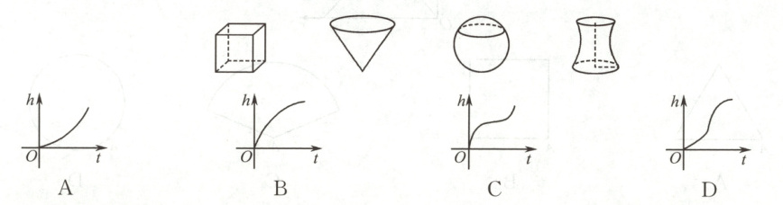 7.BCD对于A,水面的高度$h$的增加应是均匀的,A错误;对于B,漏斗型下小上大,水面的高度$h$的增加越来越慢,B正确;对于C,球体中间最大,上下较小,水面的高度$h$的增加越来越慢,然后慢慢变快,C正确;对于D,上下大,中间小,水面的高度$h$的增加越来越快,然后慢慢变慢,D正确。