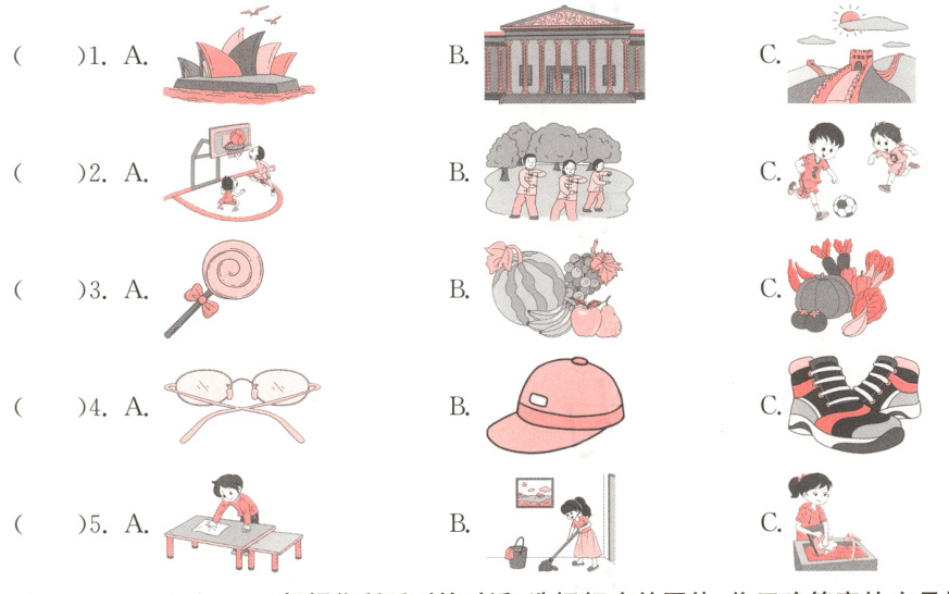 Ⅰ. Listen and choose. 根据你所听到的句子,选择相应的图片,将正确答案的序号填到括号内。每小题读两遍。(每小题2分,共10分)