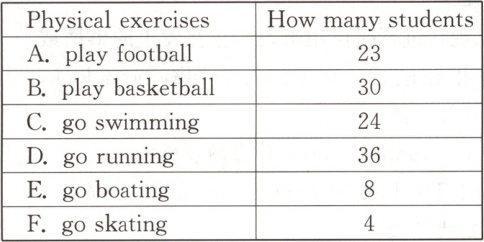 5.由箭头指向的数据可知,参加此项运动的学生有30人,再结合“Physical exercise at weekends”表格可知,此项运动是篮球,故选C。