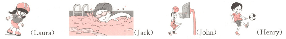 Laura likes skating. She often goes skating after school. Jack likes swimming. He sometimes goes swimming at weekends. John is a strong and healthy boy. He always plays basketball in the playground. Henry likes football very much. He always plays football after dinner.