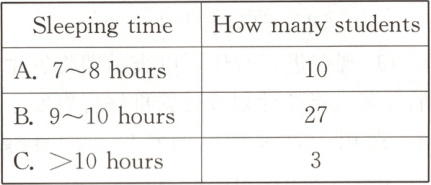 1.由“Sleeping time at weekends”表格可知,睡眠时间为9~10小时的学生有27人,故选C。