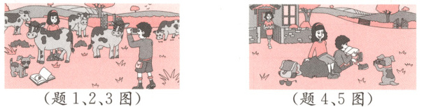 2. 题干意为:有多少头奶牛?由第一幅图可知,有五头奶牛。故答案为“There are five cows。”