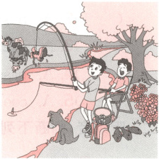 答案:1. The children are fishing. 2. Yes, there is. 3. Yes, I can. 4. There's a frog on the bag.