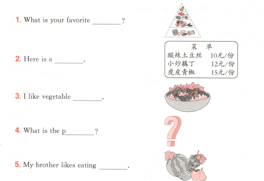 1. 图片为食物图谱,结合句意“你最喜欢的食物是什么”。故填food。