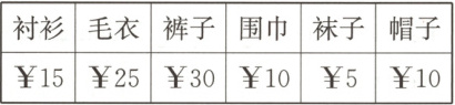 二、Jenny 有 50 元钱,她准备买三件衣物。根据表格提示,补全她和售货员的对话。