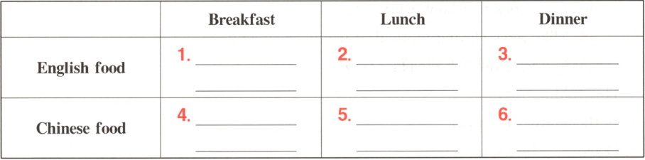 1.eggs and sausages 2.sandwiches and hamburgers 3.fish and chips 4.rice and eggs 5.meat,vegetables and dumplings 6.vegetables,soup and noodles