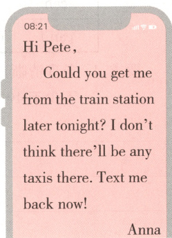) 1. What does Anna want Pete to do?A. To order a taxi to pick her up from the station.