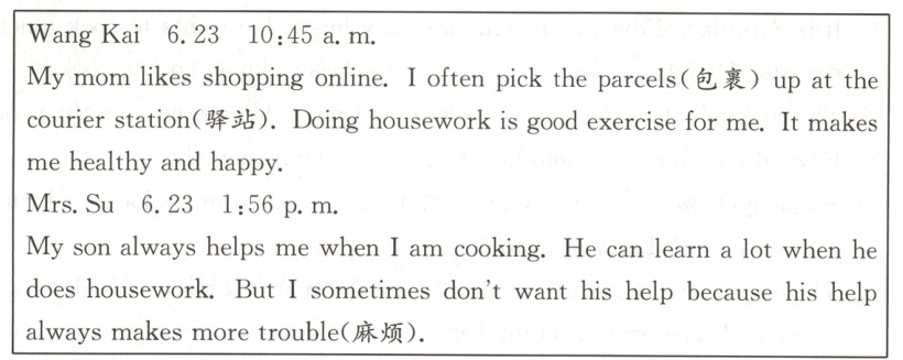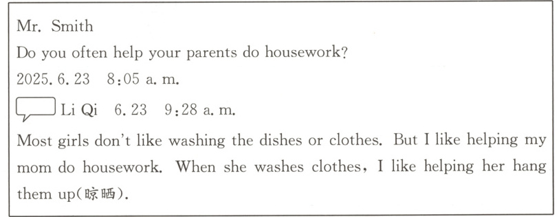 十一、[实验班原创 语言能力]Smith老师发了一条关于“你是否经常帮助父母做家务”的朋友圈。同学们对此发表了自己的评论,请你根据评论内容,选择正确的答案。(10分)