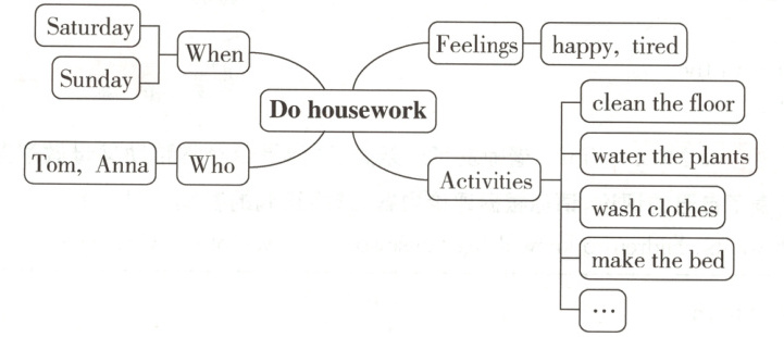 十二、假如你是Anna,你有一个弟弟名叫Tom,周末,你们能帮父母做哪些家务呢?请根据思维导图,写一篇短文。(10分)