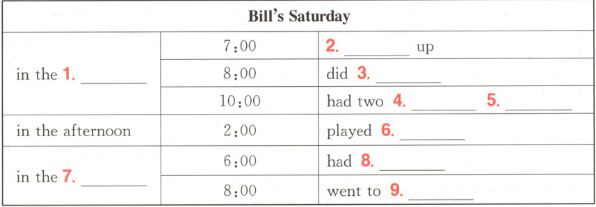 (1. morning 2. got 3. homework 4. math 5. classes 6. football 7. evening 8. dinner 9. bed)