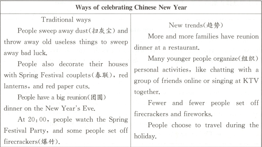 )4. Which is true about the new trends of celebrating Chinese New Year?A. All the families watch lion dances at the Spring Festival.