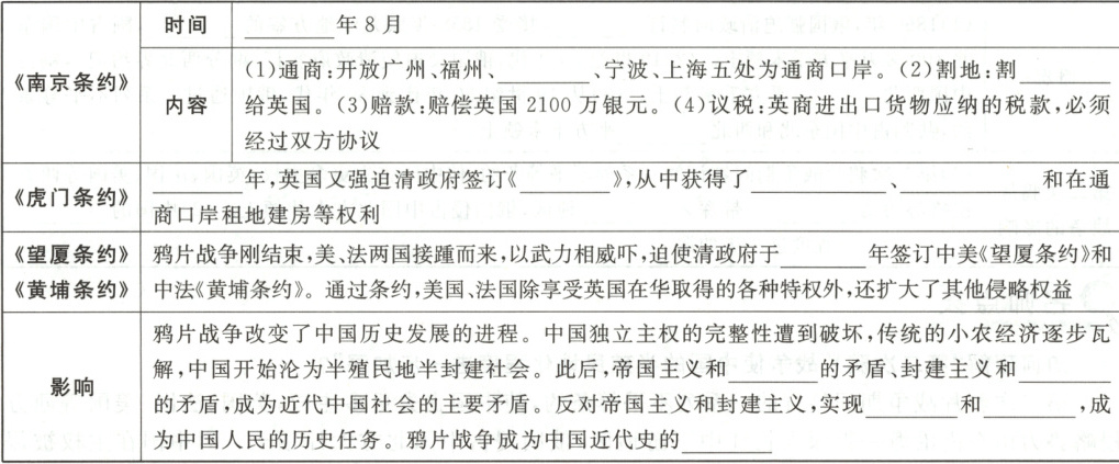 知识点三 1842 厦门 香港岛 1843 虎门条约 领事裁判权 片面最惠国待遇 1844 中华民族 人民大众 民族独立 人民解放 开端