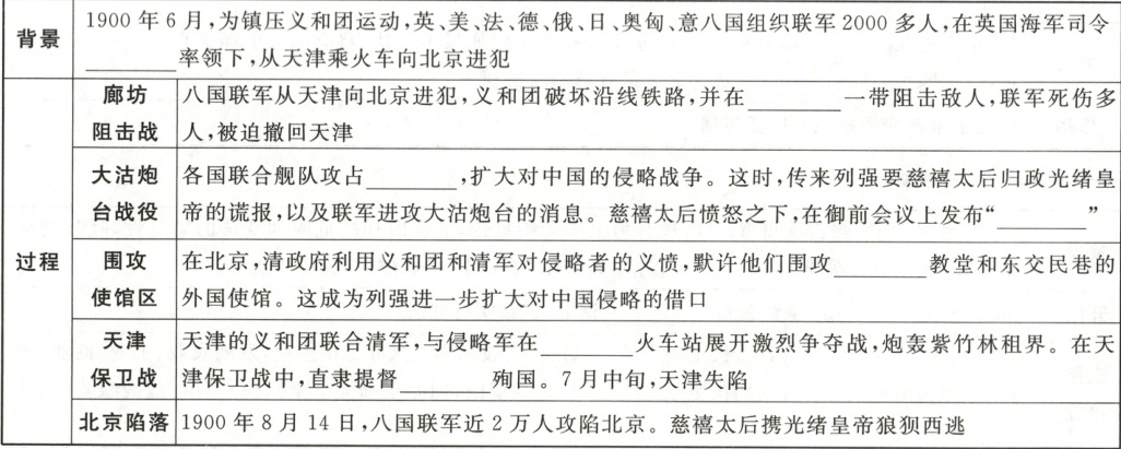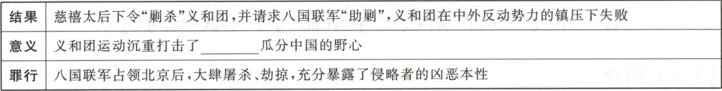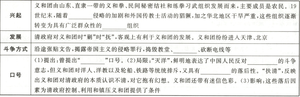 知识点一 帝国主义 反帝斗争 拆毁铁轨 扶清灭洋 帝国主义 盲目排外