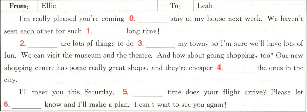 分析:1. 此处需要不定冠词 a 来构成固定短语 a long time(很长时间)。2. There be 句型表示“(某处)有……”,这里要表示“有很多事情可以做(lots of things to do)”。3. 介词 in, near 或者 around 可以用来和 town 搭配。构成 in my town(在我的城镇), near/around my town(在我的城镇附近/周边)。4. than 用来连接比较的两部分。这里作者将购物中心里的价格与城市里的价格进行比较。5. 固定搭配 what time 用于提问时间。6. 本篇文章主语为第一人称, let 后接人称代词宾格 me。