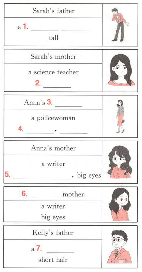 1. maths teacher 2. beautiful 3. aunt 4. tall, beautiful 5. long hair 6. Kelly’s 7. reporter