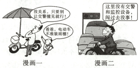 (2)无论是私自加装雨棚还是闯红灯,都是违反交通规则的行为。漫画中人物的行为扰乱了社会秩序,不珍爱生命,应当受到相应处罚。遵守社会规则需要他律和自律。我们要坚定地维护规则,从自己做起,自觉遵守规则。要用恰当的方法,提醒、劝导、帮助他人遵守规则。
