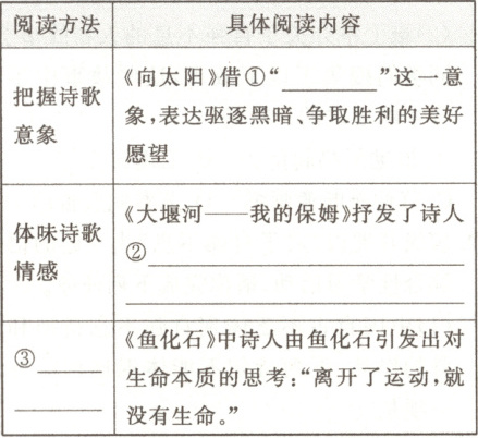 7. 小桂在阅读《艾青诗选》时采用了以下阅读方法,请完成下表。