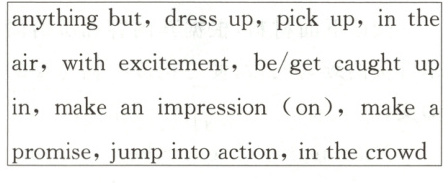 1.get/be caught up in 2.in the air 3.jump into action 4.with excitement 5.anything but 6.picked up 7.dressed up 8.make an impression 9.make a promise 10.in the crowd