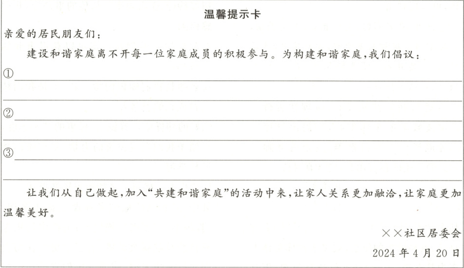 (2)本题考查如何建设美好家庭。采用倡议书的形式,将所学知识传递给社区居民,共同建设美好家庭。