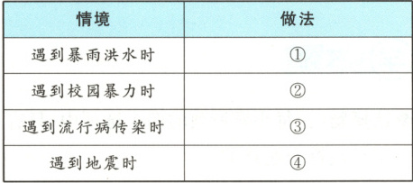 【答案】①沉着冷静,寻找地势较高的广场、坚固的多层建筑避险;积极寻求救援;若被洪水包围时,尽可能利用船只、门板等工具做水上转移;等等。②沉着冷静,采取迂回战术,尽可能拖延时间;不要激怒对方;分散对方的注意力,获取对方信任;上下学结伴而行;及时向老师和家长说明情况,寻求帮助;等等。③讲究个人卫生,多通风、勤洗手,不去人多的地方凑热闹;外出佩戴口罩,做好个人防护;若身体出现不适症状,及时就医;等等。④先躲避,桌子床下找空隙,靠在墙角曲身体,抓住机会逃出去,远离所有建筑物,余震时蹲在开阔空地。