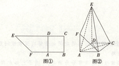 【例4】 如图①所示,已知在梯形$ BFEC $中,$ BF // EC $,$ EC = 3 $,$ BF = 2 $,四边形$ ABCD $是边长为$ 1 $的正方形,沿$ AD $将四边形$ EDAF $折起,使得平面$ EDAF \perp $平面$ ABCD $,得到如图②所示的几何体。