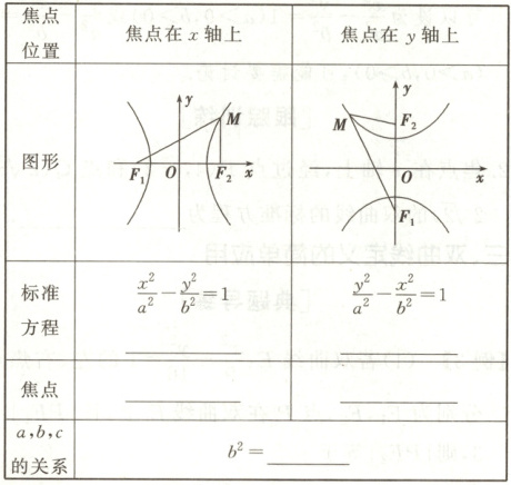 由双曲线的定义知,$2c > 2a$,即$c > a$,所以$c^2 - a^2 > 0$,类比椭圆标准方程的建立过程,令$b^2 = c^2 - a^2$,其中$b > 0$,代入上式,得$\frac{x^2}{a^2} - \frac{y^2}{b^2} = 1(a > 0,b > 0)$.