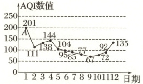 12. AQI 表示空气质量指数,AQI 的数值越小,表明空气质量越好,当 AQI 的数值不大于 100 时称空气质量为“优良”。如图是某地 3 月 1 日到 12 日 AQI 的数值的统计数据,图中点 $ A $ 表示 3 月 1 日的 AQI 的数值为 201。则下列叙述不正确的是(