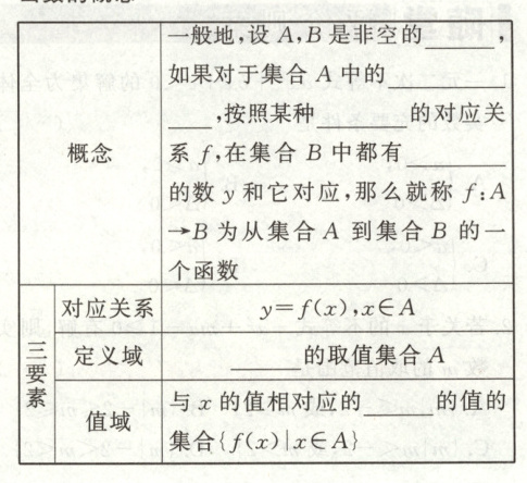 提示 不同点:课本中的问题1,2是用解析式刻画两个变量之间的对应关系,问题3是用图象刻画两个变量之间的对应关系,问题4是用表格刻画两个变量之间的对应关系.共同点:①都包含两个非空的实数集,分别用A,B来表示;②两个实数集之间都有一种确定的对应关系;③对于数集A中的任意一个数x,按照对应关系,在数集B中都有唯一确定的数y和它对应.
