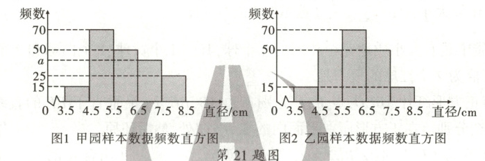 [项目背景] 无核柑橘是我省西南山区特产,该地区某村有甲、乙两块成龄无核柑橘园.在柑橘收获季节,班级同学前往该村开展综合实践活动,其中一个项目是:在日照、土质、空气湿度等外部环境基本一致的条件下,对两块柑橘园的优质柑橘情况进行调查统计,为柑橘园的发展规划提供一些参考.