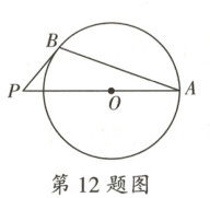 12. 如图,$ AB $是$ \odot O $的弦,$ PB $与$ \odot O $相切于点$ B $,圆心$ O $在线段$ PA $上.已知$ \angle P = 50° $,则$ \angle PAB $的大小为$ $