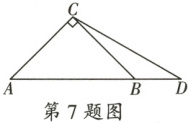 7. 如图,在$Rt\triangle ABC$中,$AC=BC=2$,点$D$在$AB$的延长线上,且$CD=AB$,则$BD$的长为(
