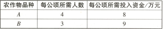 17. [核心素养·抽象能力]乡村振兴战略实施以来,很多外出人员返乡创业.某村有部分返乡青年承包了一些田地.采用新技术种植$A$,$B$两种农作物,种植这两种农作物每公顷所需人数和投入资金如表: