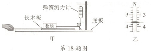 18. 核心素养·科学探究 小明同学利用如图甲所示的实验装置测量滑动摩擦力的大小。在水平底板上正确安装好装置后,先给弹簧测力计调零,再调节定滑轮和物块的位置,使细线与物块相连的部分保持水平,与弹簧测力计相连的部分保持竖直。