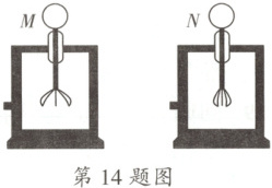 14. 如图所示,M、N为两个相同的验电器,M带正电,N带负电,M的金属箔张开的角度大于N的金属箔张开的角度。若用一带绝缘柄的金属棒把M和N的金属球连接起来,则 (