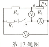 17.D 【解析】本题主要考查动态电路分析。由电路图可知,滑动变阻器R₁与定值电阻R₂、R₃串联,电压表V₁测R₁两端的电压,电压表V₂测R₁和R₂两端总电压,电流表测电路中电流。