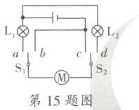 15. 某兴趣小组为了研究利用单刀双掷开关控制小直流电动机的正转、反转和不转,设计了如图所示的电路,$S_{1}$、$S_{2}$为单刀双掷开关,$L_{1}$、$L_{2}$为指示灯。规定电流从电动机M的左端流入,电动机正转。下列说法正确的是 (