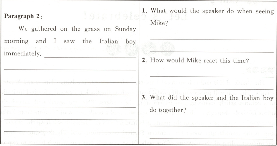 任务一:The article mainly talks about on the school picnic day how the author asked his mother for help in preparing some traditional Italian food for Mike,a new classmate from Italy.