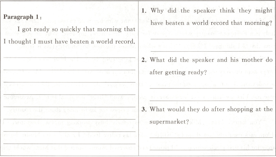 I got ready so quickly that morning that I thought I must have beaten a world record. In five minutes I had my trousers and T-shirt pulled on,and hurriedly emptied my piggy bank. With all the money I saved carefully put in my pocket,I rushed to meet my smiling mum at the front gate. We went to stands of fresh fruits and vegetables,selecting some for making pizza. Proudly looking at the products,Mum and I drove back home in high spirits. I could picture the perfect pizza which my mother was expert in cooking and the new boy’s amazed face.