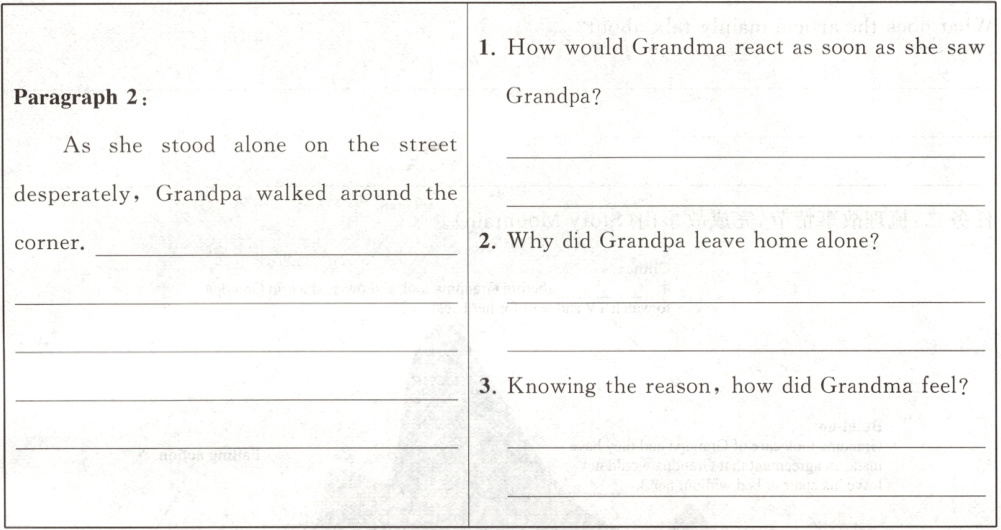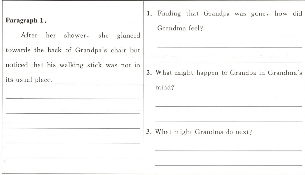 任务三:Paragraph 1: 1. She thought Grandpa had gone outside and felt very worried about his safety. 2. Grandpa might fall to the ground and get injured or lost in the street. 3. Grandma might keep looking for Grandpa wherever she thought possible. Paragraph 2: 1. She scolded Grandpa for going out alone. 2. Grandpa bought a present for Grandma. 3. Grandma was very surprised and moved.
