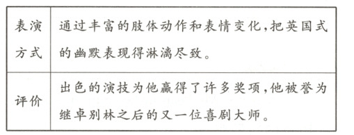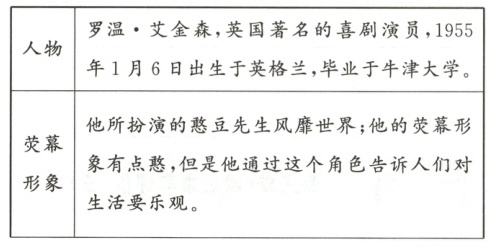 【写词块,转换表达方式】outstanding/distinguished;acknowledge;persona;make use of;varied;present;honour 【补要点,写长、短佳句】③Rowan Atkinson, also known as Mr Bean, is a distinguished British comedian. ⑤It is the character Mr Bean that makes him outstanding. ⑧His excellent acting has won him many awards and he was honoured as another master of comedy after Chaplin.